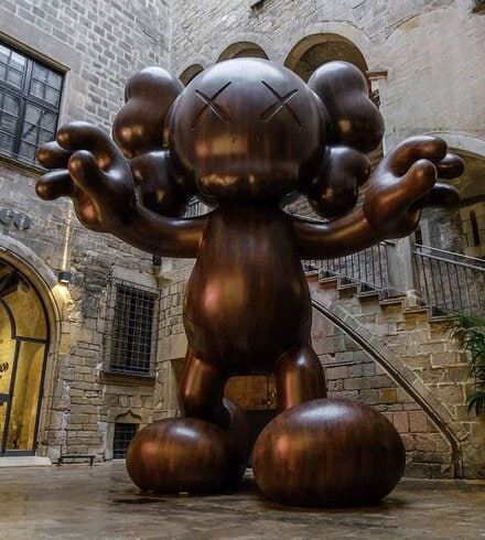 Among these works, you can recently find the imposing sculpted piece by Kaws, this internationally renowned New York artist. His sculpture, named “The giant”, is 6 meters high and was manufactured with a very specific sustainable wood called Afrormosia from Central Africa. This statue represents the iconic character of Kaws initially inspired by Mickey. The giant welcomes you directly to the cobbled courtyard of the entrance to the MOCO Museum in Barcelona on your next visit.