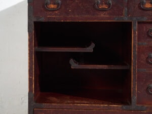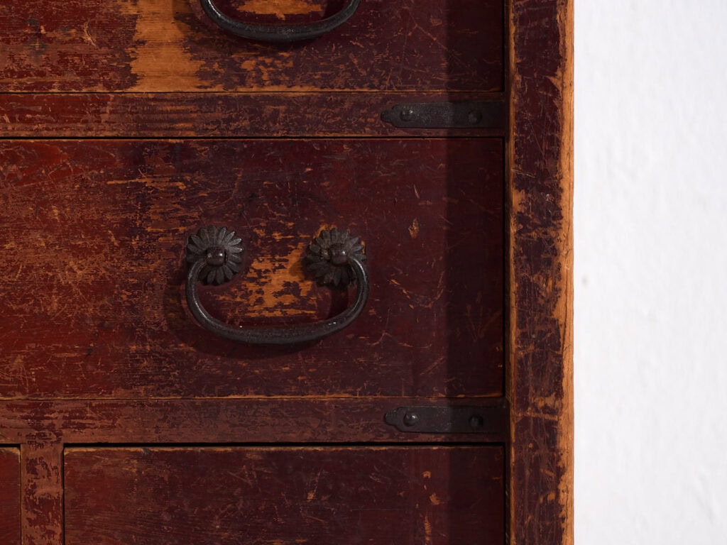 Made of Japanese sugi wood with original wrought iron hardware, it retains an extraordinary patina and natural marks of use that reflect its history and authenticity. Its layout of small drawers and the large bottom drawer show a clear organizational function, typical of late 19th century Japanese mercantile furniture.
