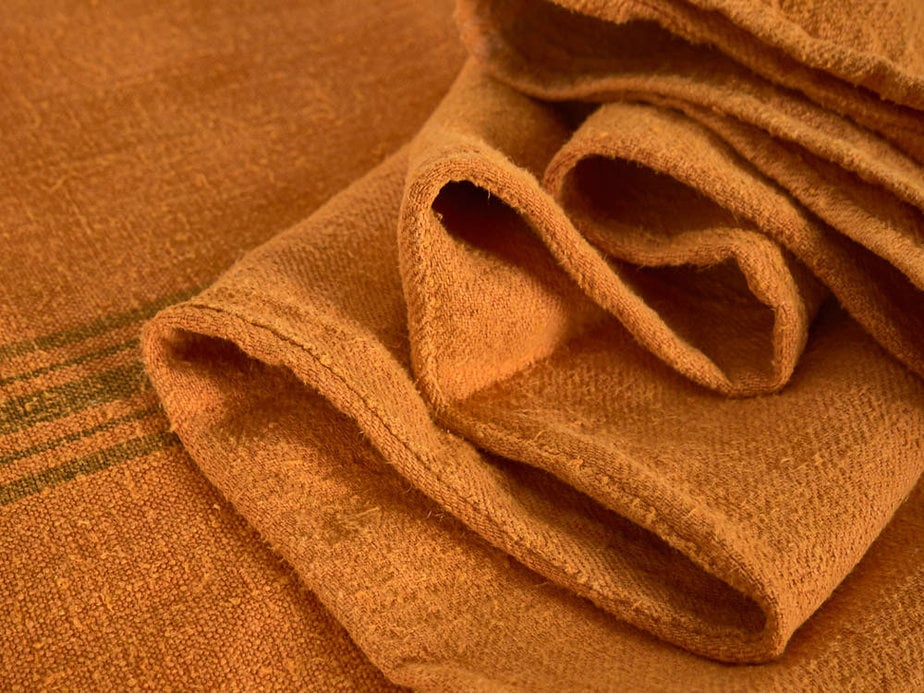Antique orange linen cushion handmade from antique flour sacks.