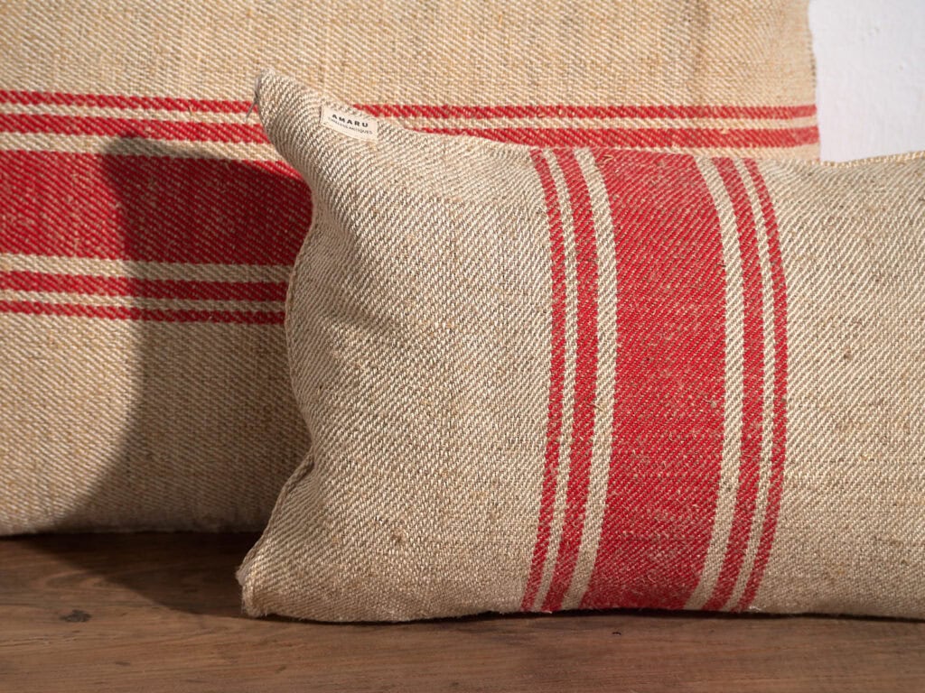Red antique linen cushions handcrafted from antique flour sacks.