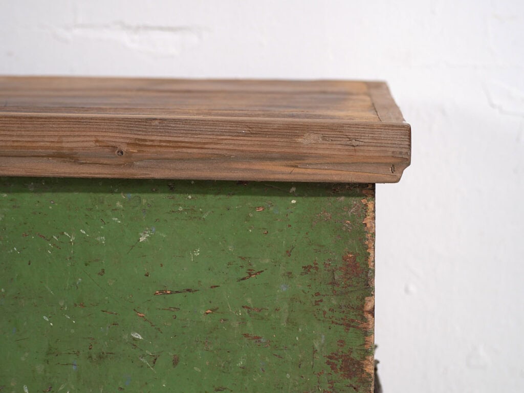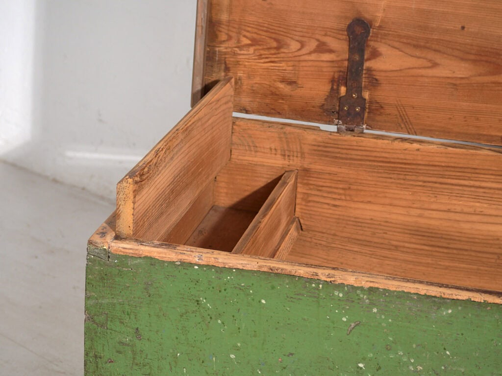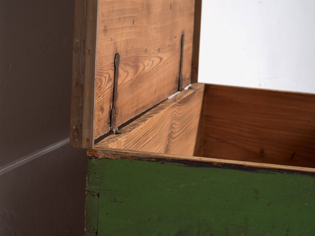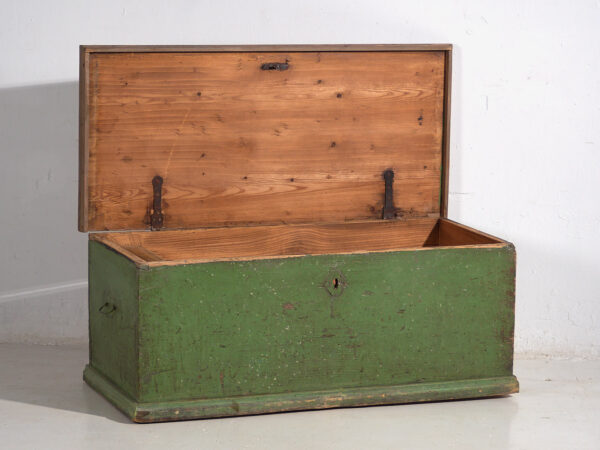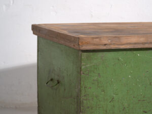 Give a point of originality to your home with this unique piece, which merges with the contemporary style bringing personality to your home. This antique green trunk can be combined with any of our armchairs or with our available antique cabinets.