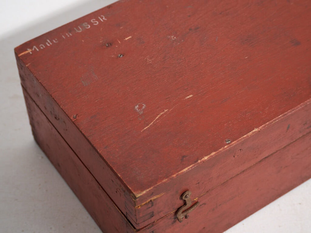 The metal lock is believed to be the original lock and is still intact. This vintage rifle case was used to store a Kalashnikov rifle in Soviet times. The words “Made in USSR” can be seen on the front.