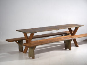Conjunto de mesa y bancos antiguos (c.1920). Conjunto de 3 piezas