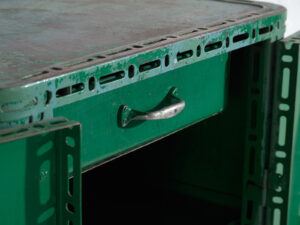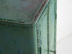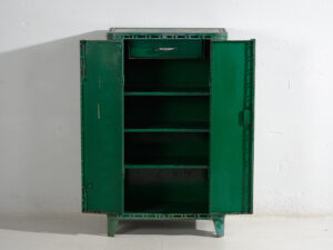Notre armoire vintage se compose d’une paire de portes avec quatre grands plateaux à l’intérieur du cadre, et un tiroir en haut. Ce meuble de style industriel est construit avec de l’acier, ce qui lui assure une grande durabilité et robustesse.