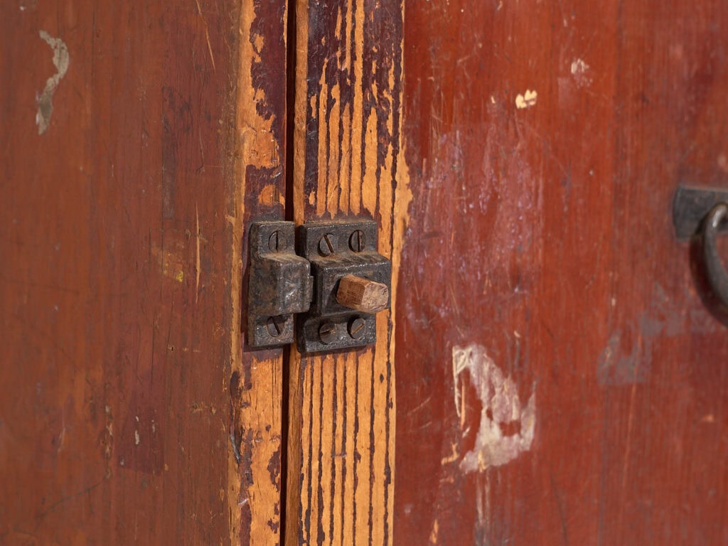 La porte frontale à charnières conserve sa poignée en fer d’origine ainsi qu’un système de fermeture simple et durable. La surface présente une patine profonde et sincère, marquée par des traces d’usure, des pertes ponctuelles de finition, des abrasions et des zones éclaircies par la manipulation répétée, notamment sur les arêtes et le cadre de la porte. Ces marques participent pleinement à son esthétique wabi-sabi et à son authenticité.