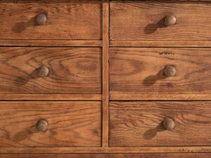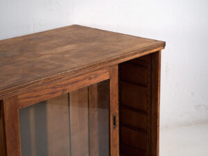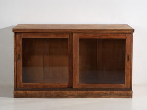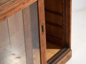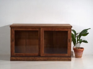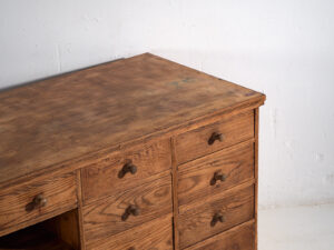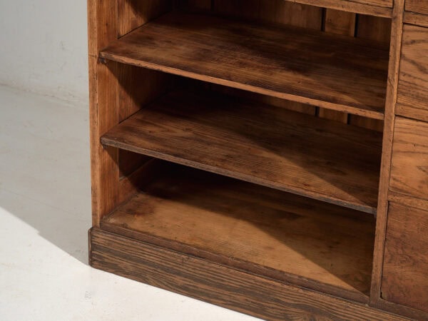 Comptoir de magasin ancien avec portes vitrées et bloc-tiroirs à l’arrière (vers 1920)