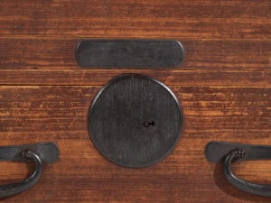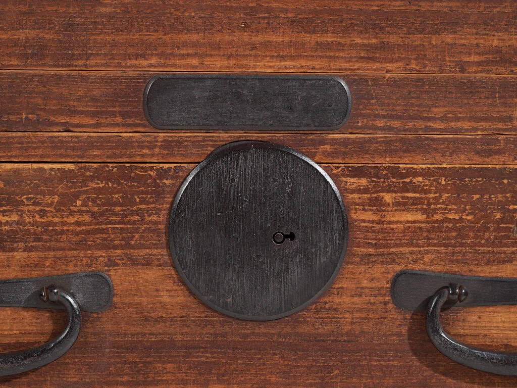 La façade présente des ferrures en fer d’origine, comprenant des poignées encastrées, des plaques de fermeture circulaires et des renforts d’angle. Ces éléments assurent la solidité de la structure tout en créant un contraste graphique sobre avec la teinte chaude du bois. La surface conserve une patine profonde et irrégulière, marquée par des traces d’usage, des rayures et des arêtes adoucies, témoignant de plusieurs décennies d’utilisation et renforçant son esthétique wabi-sabi.