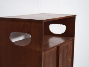 Le design est sobre et fonctionnel, sans ornementation superflue. Les poignées métalliques discrètes et les découpes latérales facilitent la manipulation du meuble et soulignent son caractère utilitaire. Le bois présente une patine chaleureuse et homogène, marquée par des traces d’usage, des abrasions et de légères variations de teinte cohérentes avec son ancienneté.