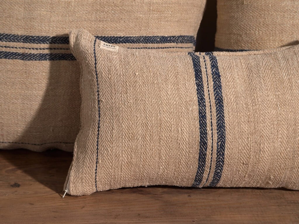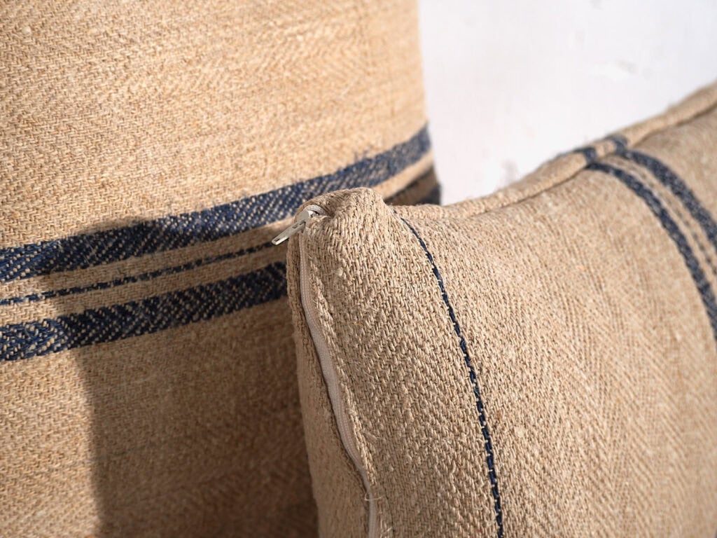 Nos coussins sont fabriqués à partir de toile de lin centenaire, avec un grammage extra-épais de 600 g/m². Rien à voir avec les toiles de lin de fabrication actuelle, qui présentent généralement un grammage d’environ 160 g/m². Nos coussins résisteront sans aucun doute au passage du temps grâce à leur durabilité et leur grande résistance.