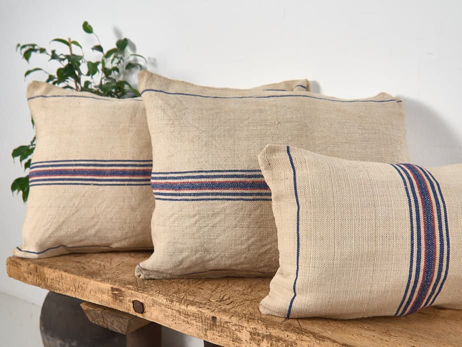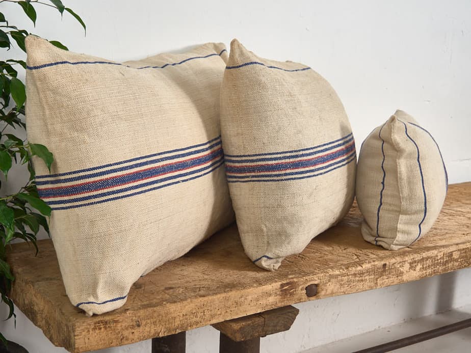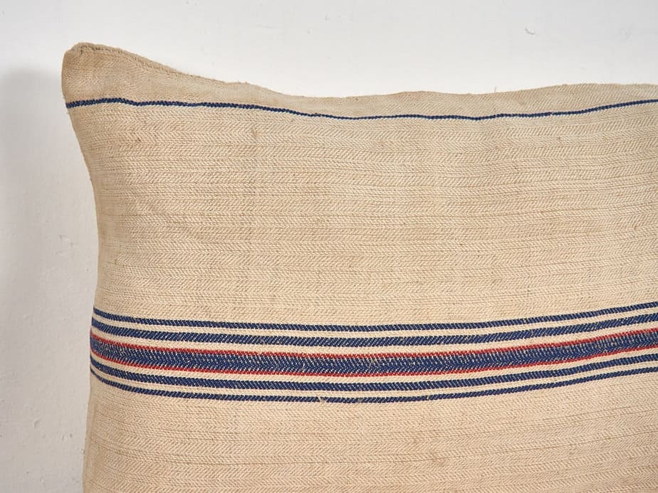 Coussin ancien en lin à rayures bleues et rouges, fabriqué à la main à partir des anciens sacs de farine.