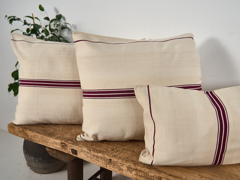 Coussin ancien en lin à rayures rouges, fabriqué à la main à partir des anciens sacs de farine.