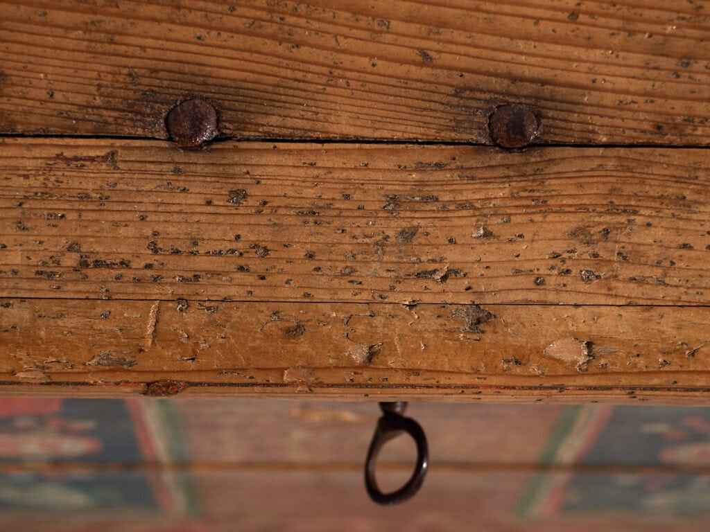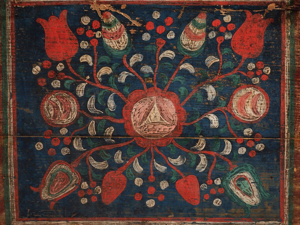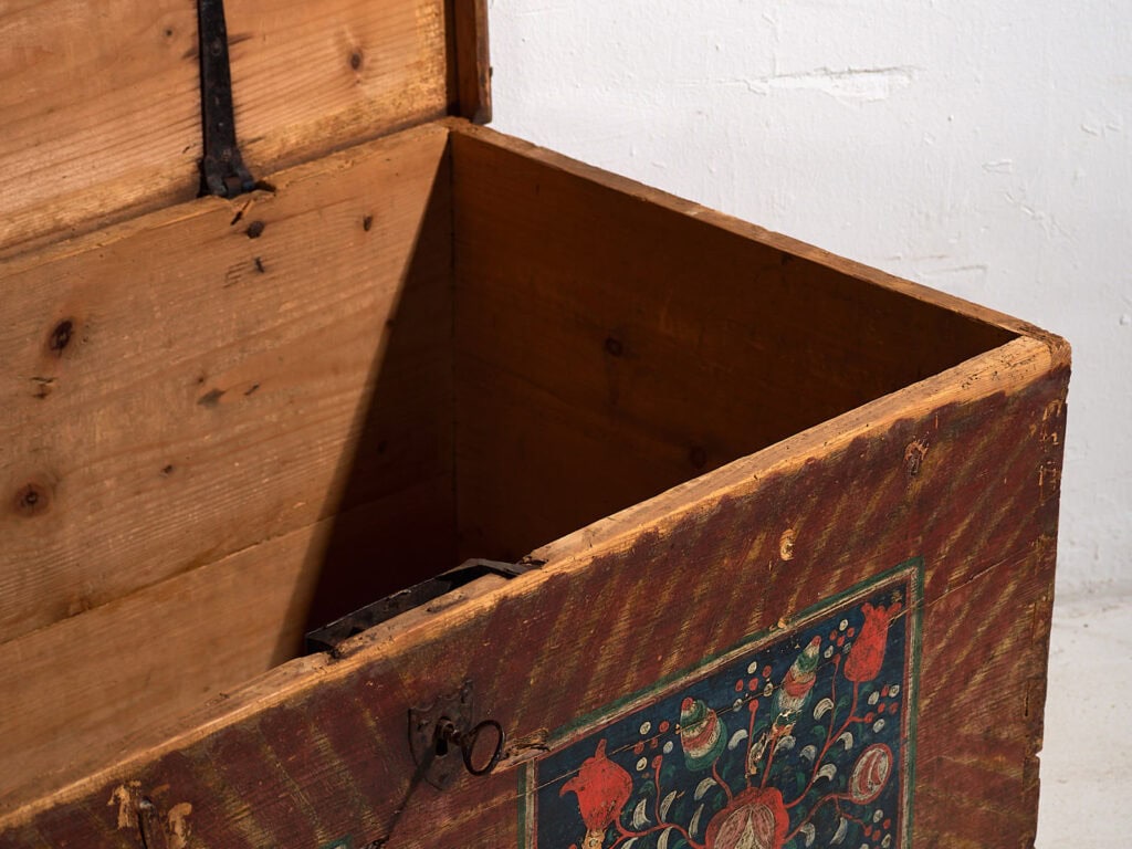 Ancienne malle de rangement à motifs floraux (vers 1865)