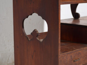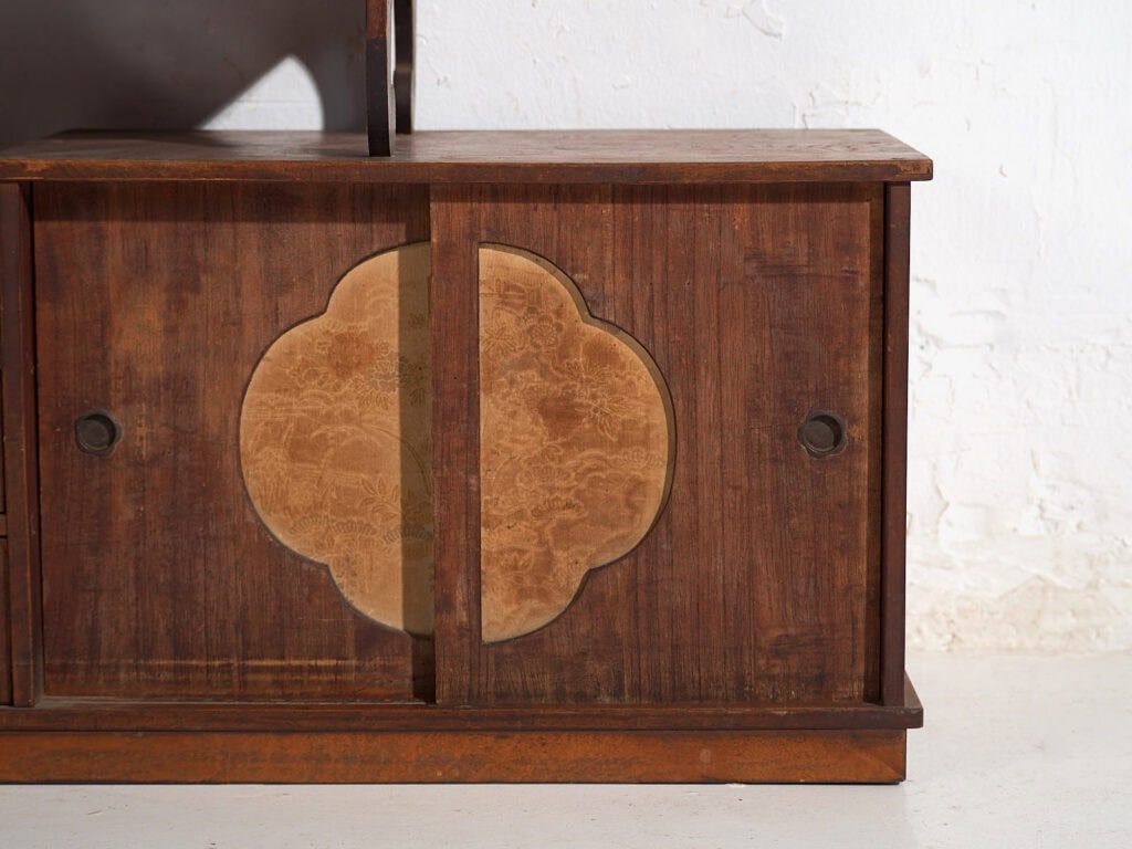 La partie inférieure intègre des portes coulissantes décorées de panneaux découpés accueillant un papier décoratif d’origine aux motifs végétaux discrets. Ce procédé, courant durant la période Meiji, apporte une légèreté visuelle et une dimension poétique sans recourir à une ornementation excessive. Le papier présente un vieillissement naturel, cohérent avec son ancienneté.