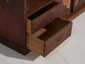 Les parties supérieure et latérales sont organisées autour de petits tiroirs et d’espaces ouverts, disposés de manière asymétrique mais équilibrée. Les poignées circulaires et les ferrures métalliques sont d’origine, en fer foncé, avec une usure homogène parfaitement intégrée à l’ensemble.
