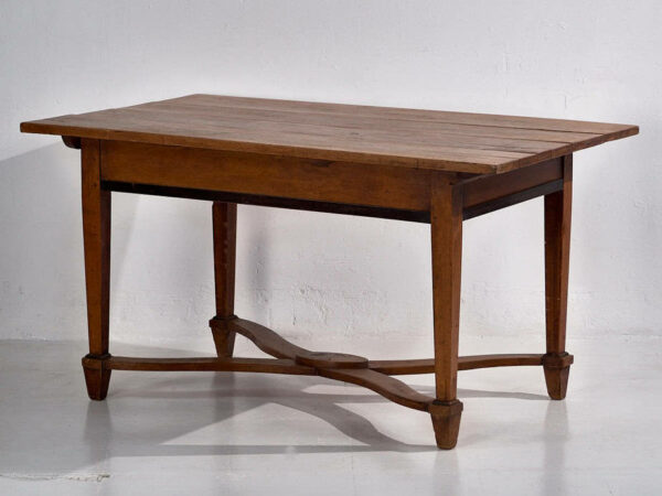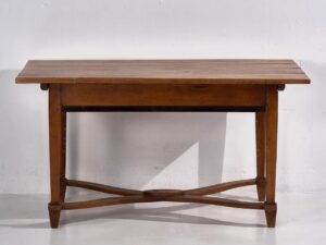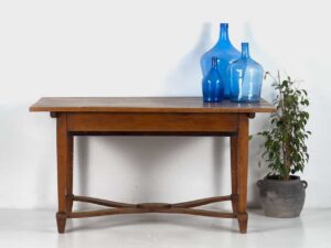 Le plateau est en bois de pin massif de couleur bois naturel. Le corps de notre grande table a aussi été conservé dans la couleur d’origine du bois. Elle servait de table à manger mais elle peut également être utilisée comme console d’entrée ou comme table d’appoint dans une autre pièce spacieuse de la maison ou de l’appartement.