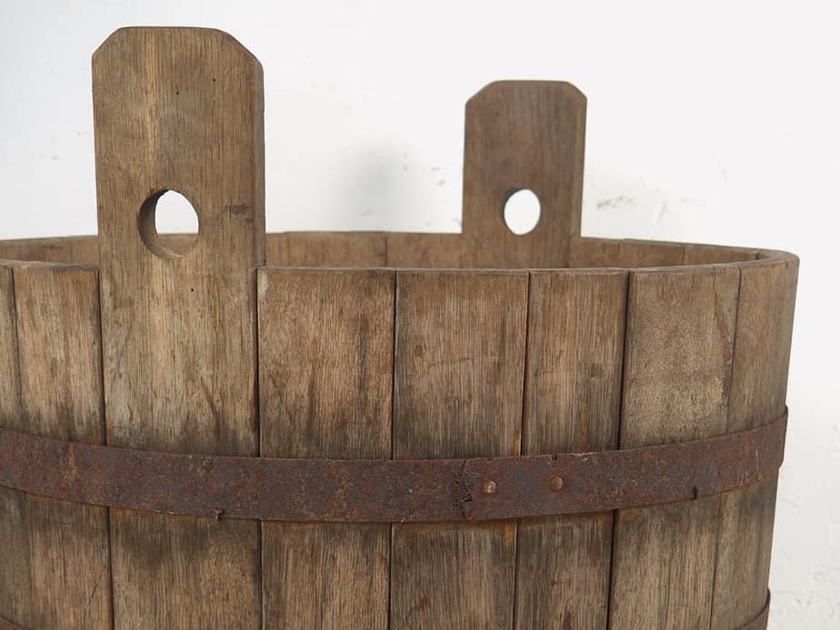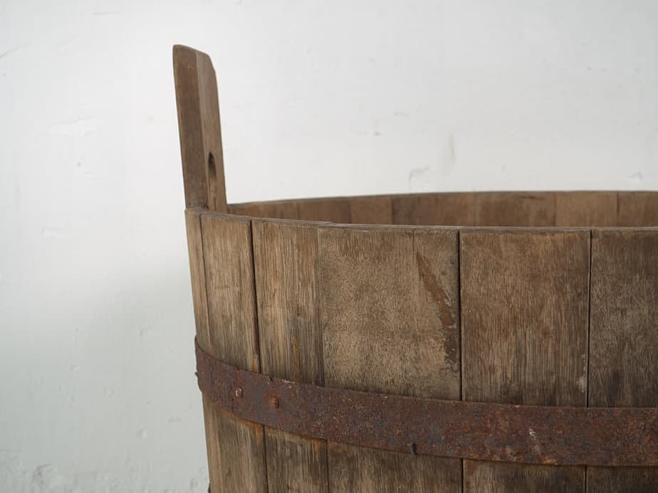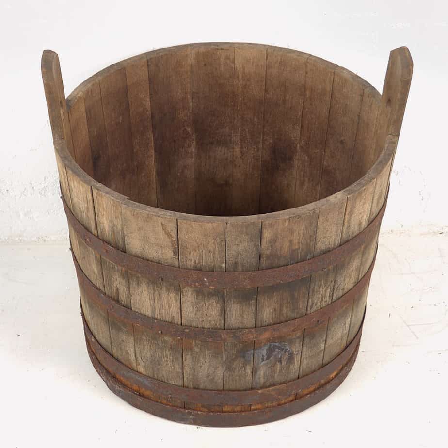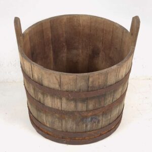 - Ses planches de chêne sont maintenues par des bandes de métal et par ses poignées en bois.