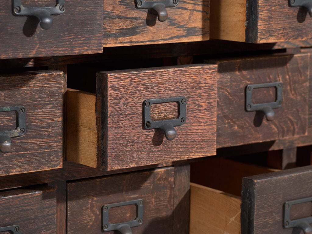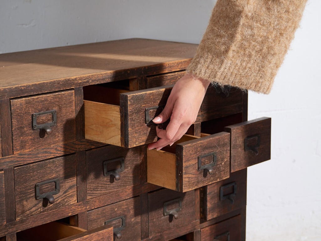 El frente presenta una repetición rítmica de cajones, cada uno equipado con tiradores metálicos originales tipo etiqueta, de hierro oscuro, con tornillería vista. Estos herrajes, junto con la modulación regular, refuerzan la lectura funcional y casi arquitectónica del mueble. Los interiores de los cajones, en madera más clara, muestran un uso limpio y coherente con su función original.