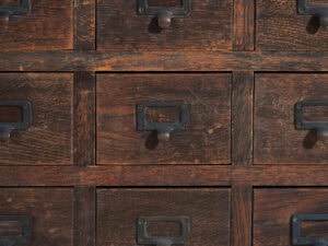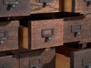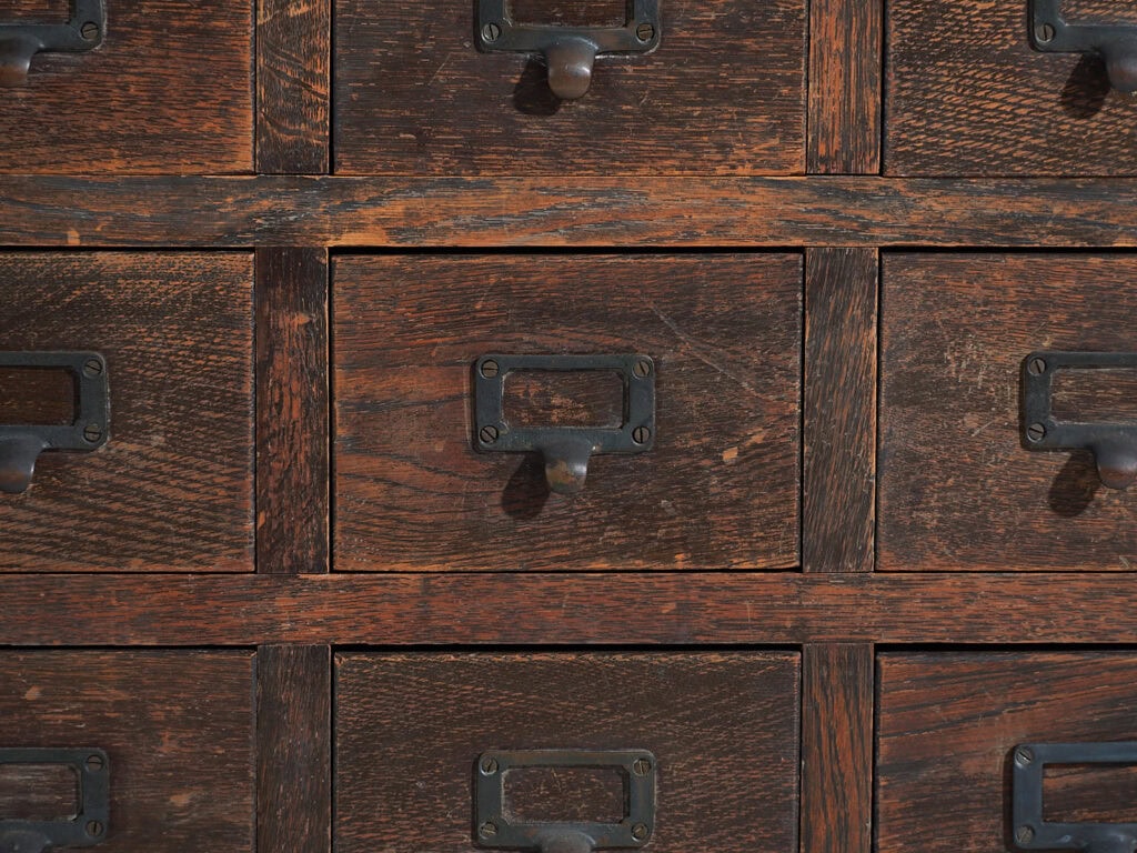 Cómoda japonesa de almacenamiento, realizada en madera maciza, con estructura horizontal y un frente compuesto por múltiples cajones de pequeño formato, concebida para la clasificación y organización minuciosa de objetos, documentos o mercancías, y datada entre el periodo Taishō y el inicio del periodo Shōwa.