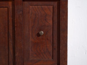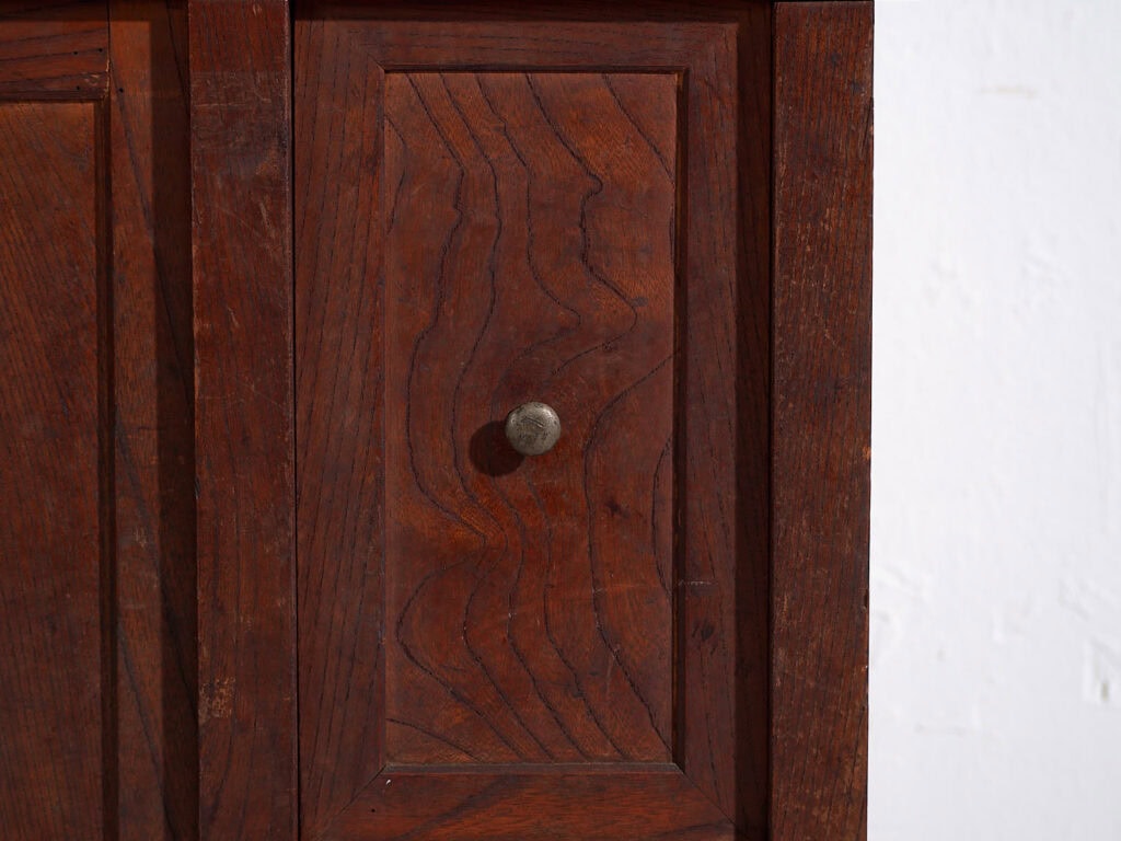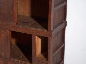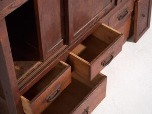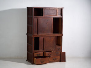 Su composición combina puertas correderas/paneladas, una balda abierta central y un conjunto de cajones inferiores de distintos tamaños, creando un equilibrio muy interesante entre zonas cerradas y abiertas. Este tipo de configuración era habitual en muebles de cocina (daidokoro tansu) o de uso multifuncional en el hogar japonés.