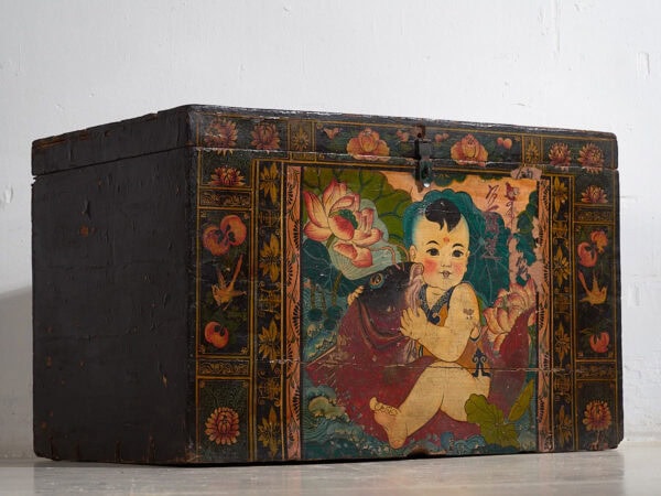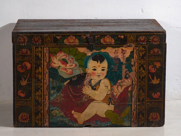 - Su pintura principal retrata a un niño con una trucha, simbolismo de prosperidad y abundancia, mientras que el marco decorativo de peonías, las “reinas de las flores” en la cultura china, aporta un toque de calidez y delicadeza.