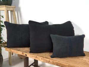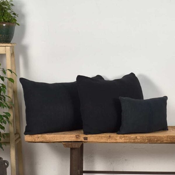 Cojín de lino antiguo de color azul oscuro confeccionado artesanalmente con sacos antiguos de harina.