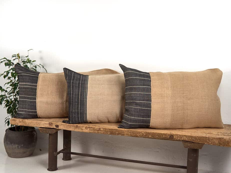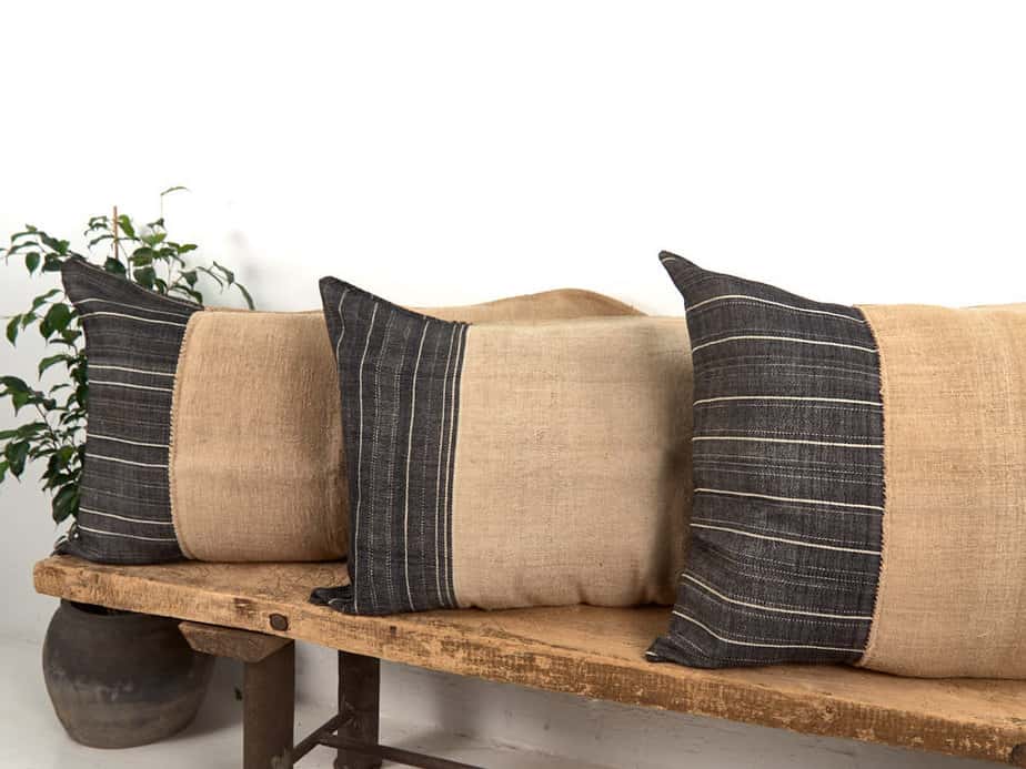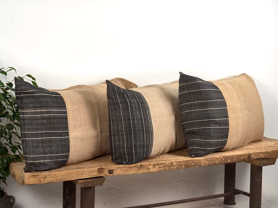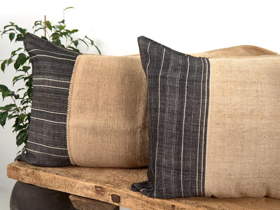 Cojín de lino antiguo de rayas color negro confeccionado artesanalmente con sacos antiguos de harina.