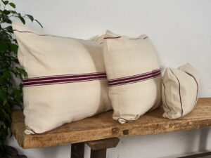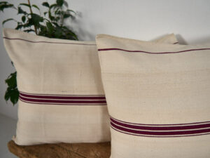 Cojín de lino antiguo de rayas rojas confeccionado artesanalmente con sacos antiguos de harina.