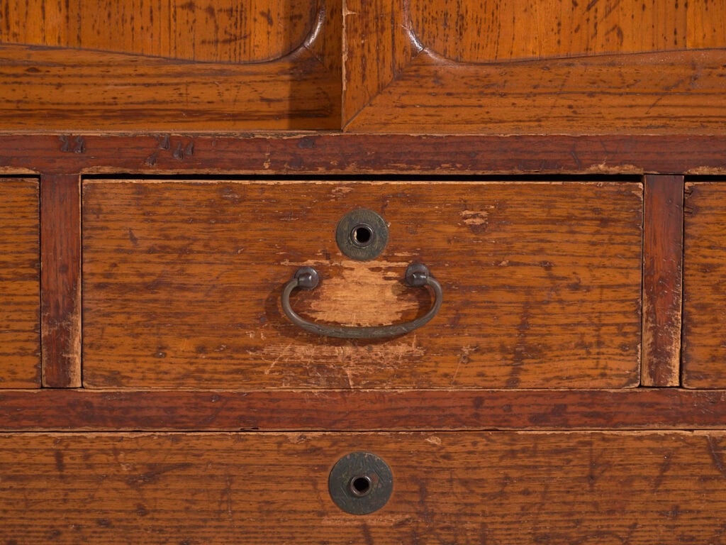 La fachada se articula mediante una sucesión de cajones con tiradores de hierro forjado originales y discretas bocallaves circulares. Los herrajes, sobrios y funcionales, aportan un contrapunto gráfico al tono cálido de la madera. La superficie conserva una pátina profunda y homogénea, con marcas de uso, abrasiones y aristas suavizadas que evidencian un envejecimiento natural y coherente con su antigüedad.