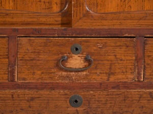La pieza está realizada en una combinación de paulownia (Paulownia spp.) y cedro japonés (Cryptomeria japonica). La paulownia, ligera y estable, se utiliza principalmente en los cuerpos de los cajones, mientras que el cedro japonés aparece en la estructura y elementos secundarios, aportando solidez y un buen comportamiento frente a la humedad. Esta combinación es característica del mobiliario japonés del primer tercio del siglo XX.