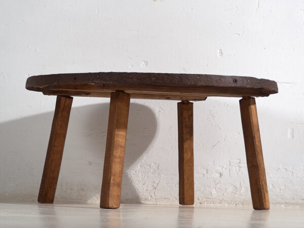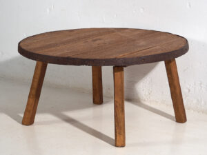 Nuestra mesa de centro redonda es una pieza única construida con madera maciza antigua y las partes metálicas de antiguas ruedas de carruajes. Destaca por: