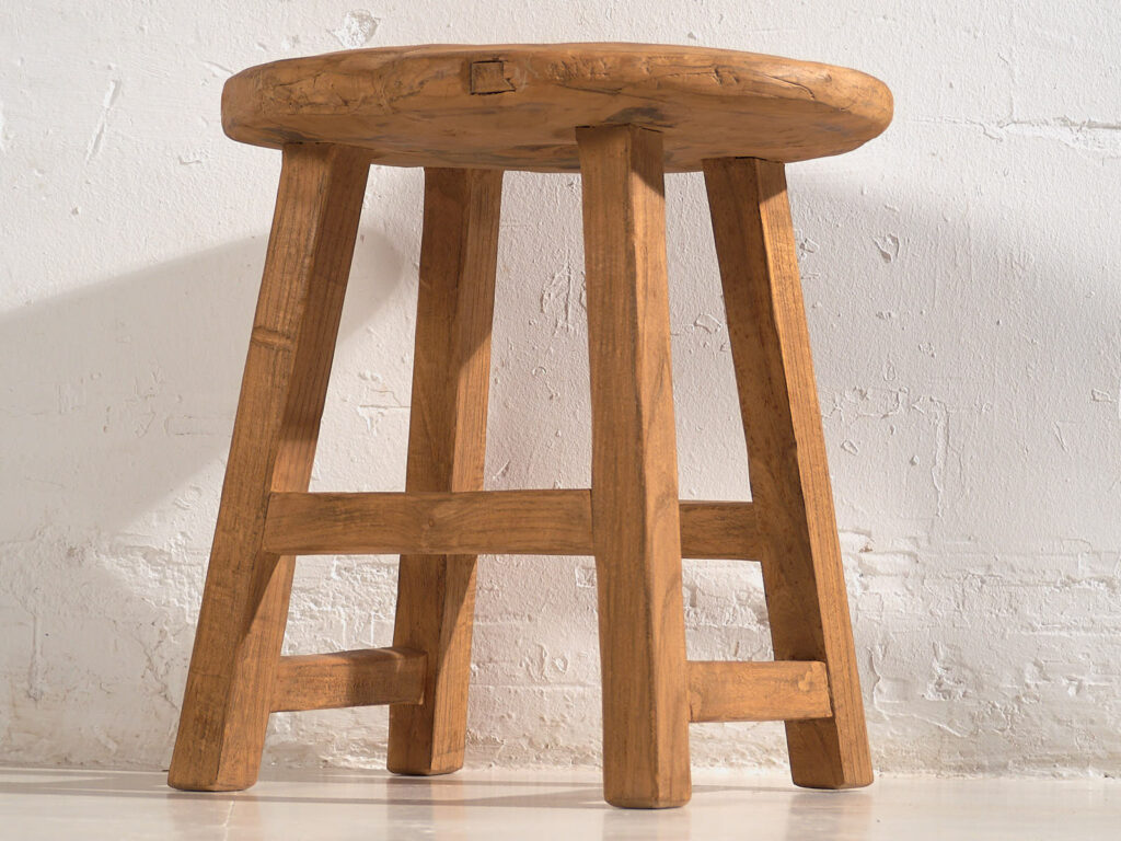 Nuestra mesa redonda la hemos construido a partir de una rueda antigua de madera como encimera y con patas de madera de olmo antigua de más de cien años de antigüedad. Hemos utilizado madera maciza de olmo antigua que ha sido restaurada artesanalmente. Con la idea en mente de construir una mesa baja de 50 cm de altura que mantenga el tipo de construcción de antaño, construimos varios ejemplares con dimensiones parecidas aunque no hay ni una pieza igual.