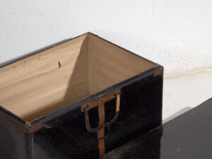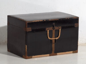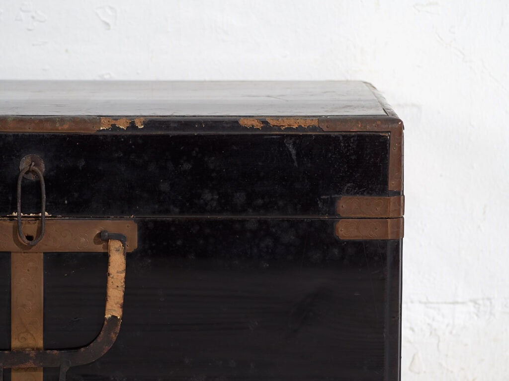 Este cofre japonés de pequeño formato fue concebido como un contenedor portátil y resistente para el almacenamiento de objetos personales, documentos o textiles. Sus proporciones compactas y su construcción reforzada indican un uso intensivo y funcional, más cercano al transporte y la protección que al mobiliario fijo.