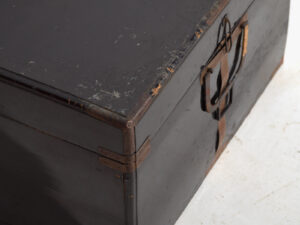 La pieza está realizada en cedro japonés (Cryptomeria japonica), una madera apreciada por su ligereza, facilidad de trabajo y resistencia a la humedad. El exterior presenta un acabado lacado oscuro, originalmente pensado para proteger la madera del desgaste y la humedad. Los herrajes de hierro refuerzan aristas y esquinas, mientras que el sistema central de cierre y el asa subrayan su función original como cofre de almacenaje seguro y transportable.
