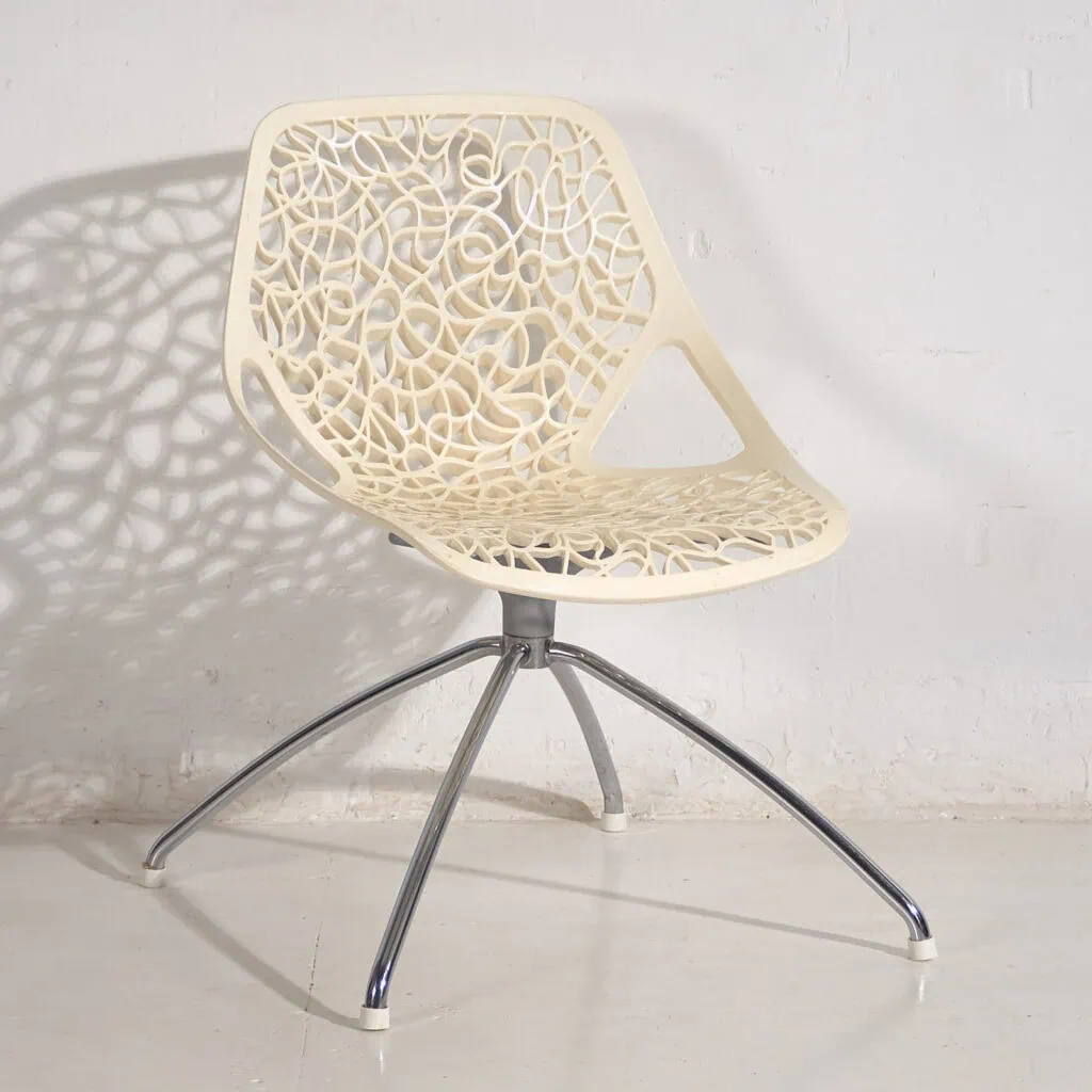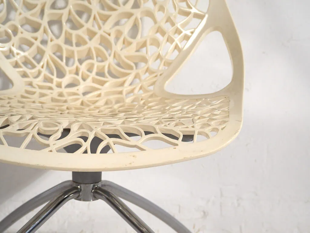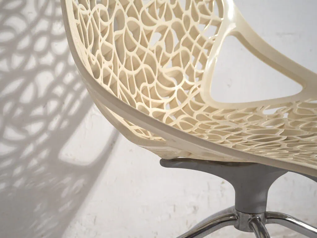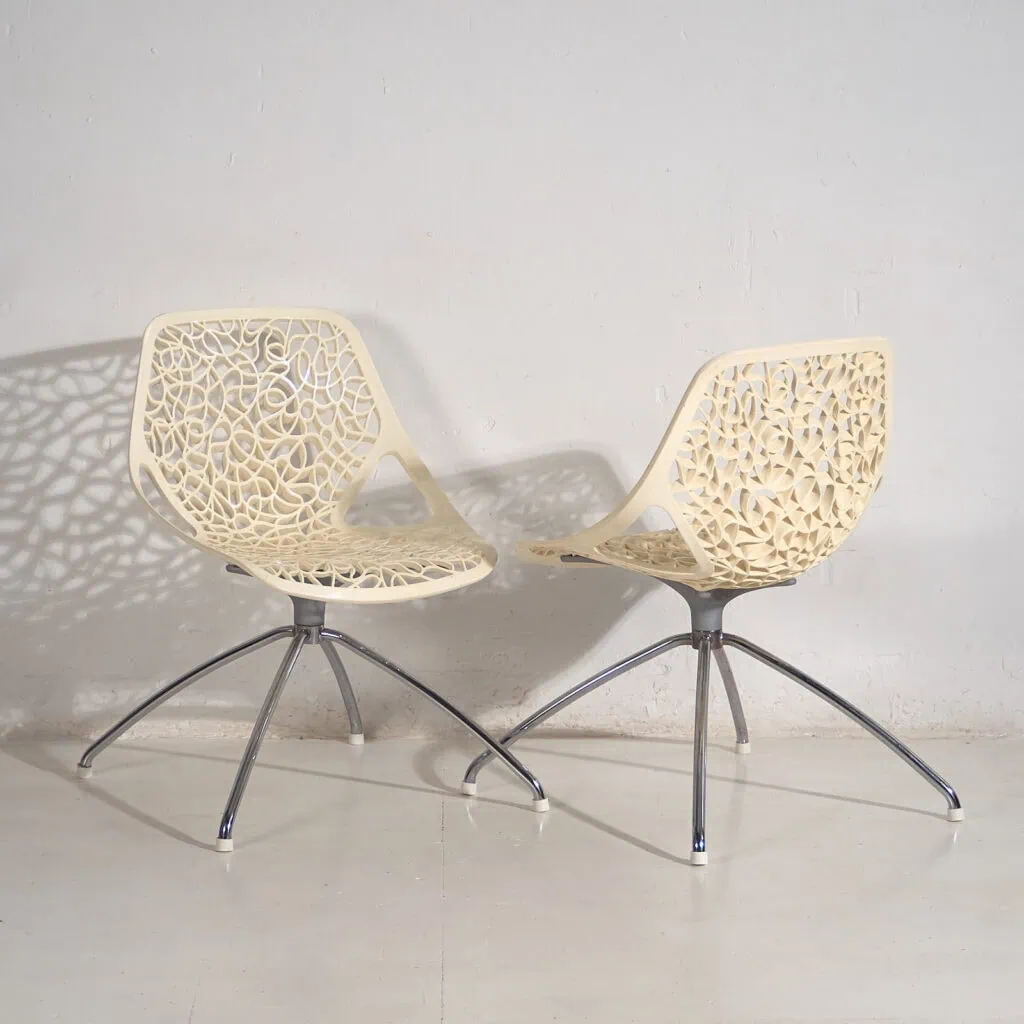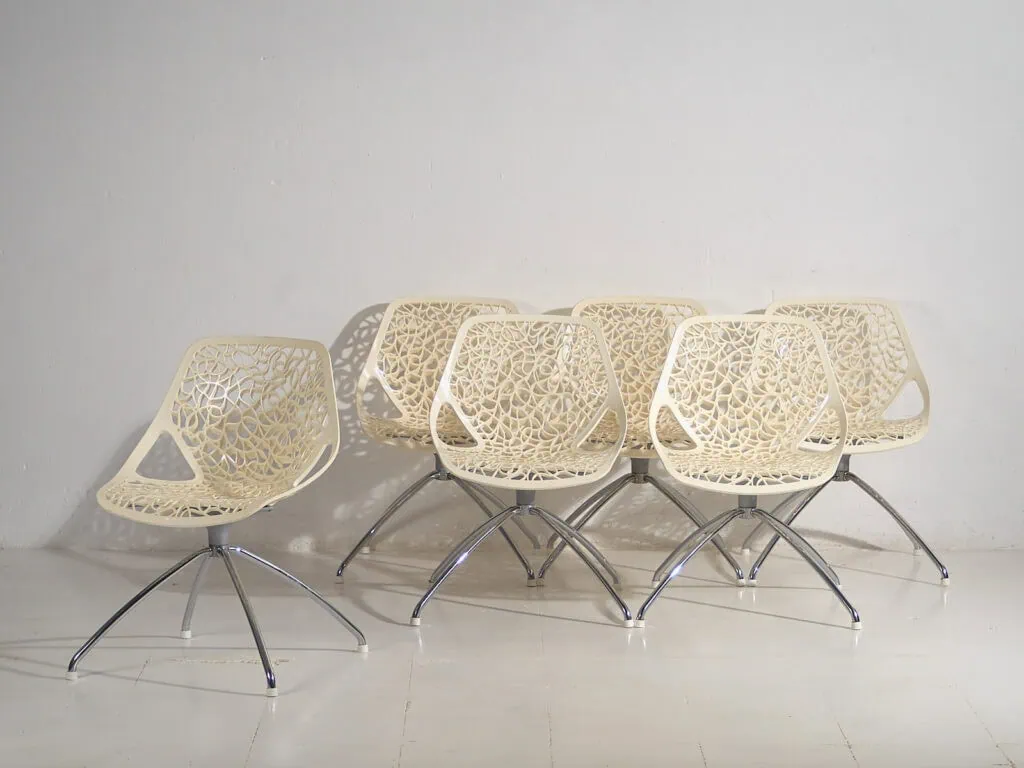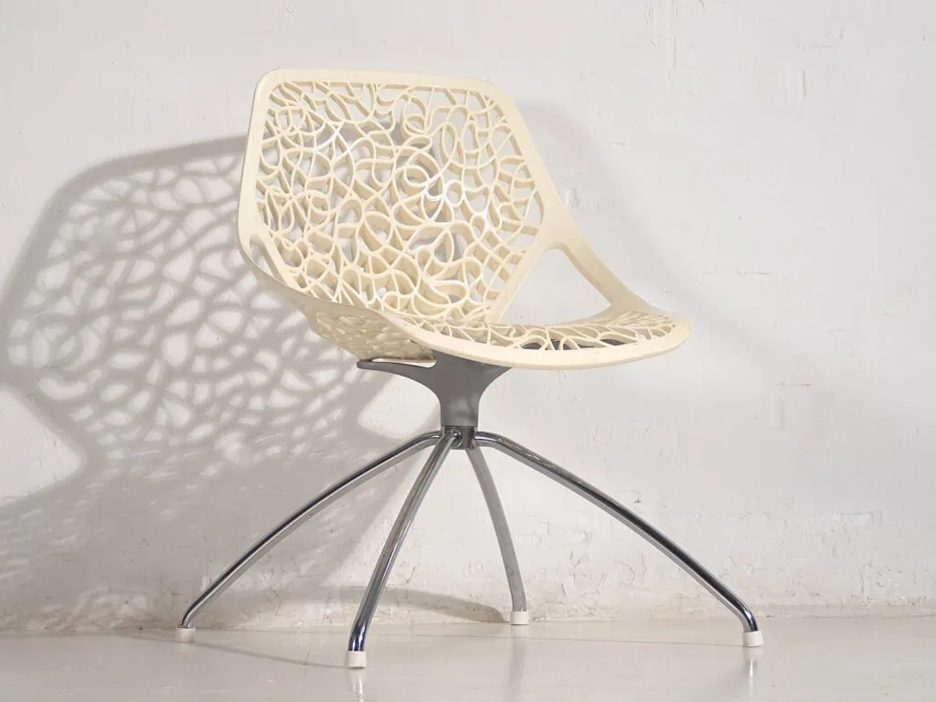 - Silla de Marcello Ziliani para Driade, muestra un diseño moderno y elegante, que recuerda a estructuras naturales como las de hojas o células.