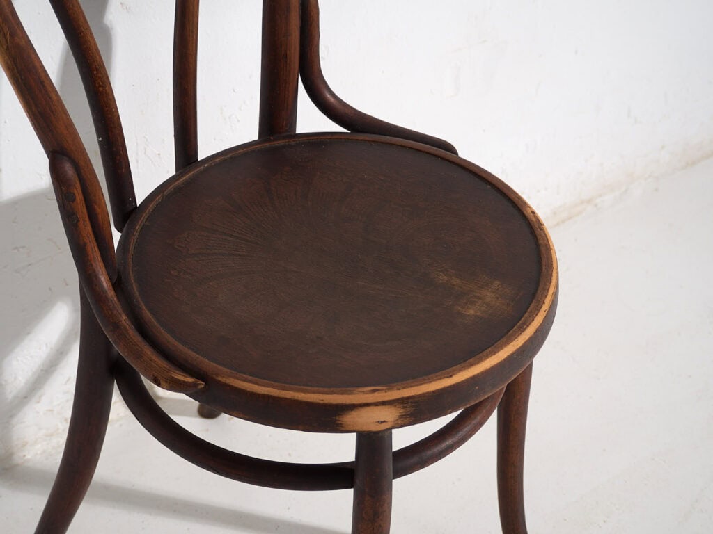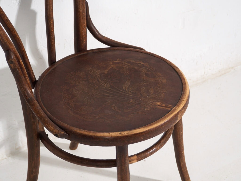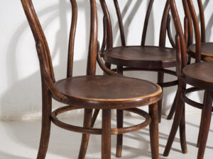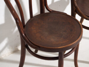 Son, sin duda alguna, verdaderas sillas Thonet; aunque la mayoría ya no conserva marca ni sello identificatorio, una de ellas aún luce la etiqueta original de Mundus.