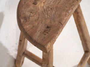 La pieza presenta una estructura sencilla de tres patas ligeramente abiertas, con proporciones irregulares que reflejan su carácter artesanal. La superficie conserva una pátina natural profundamente marcada por el uso y el paso del tiempo, aportando una fuerte presencia escultórica y una gran autenticidad.
